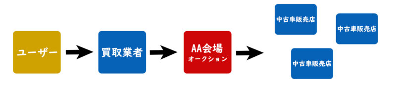 車買取というビジネスは多くの場合ユーザーから買い取った車を業者間のオートオークションへ出品し、そこでの売却で利益を出しています。店頭で販売するケースもありますが、買取価格はオートオークションでの売却でも利益が出るように算出しています。(お店で売れなくても逃げ道を作る為に)